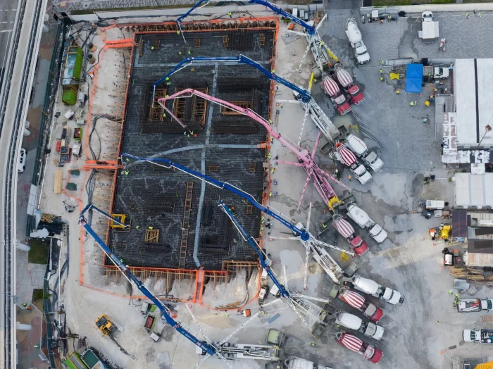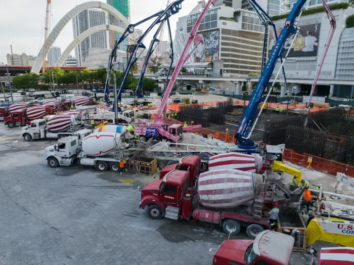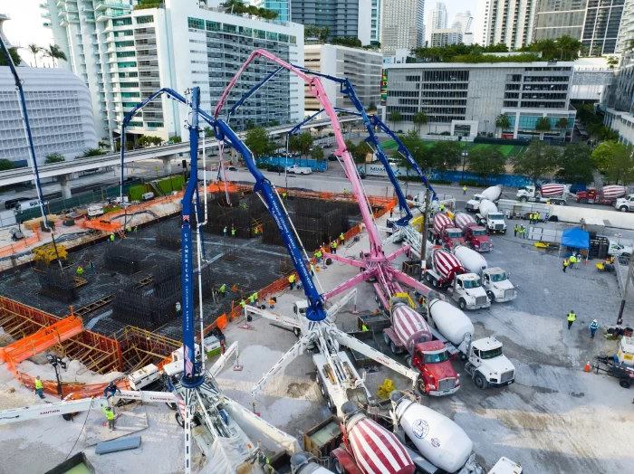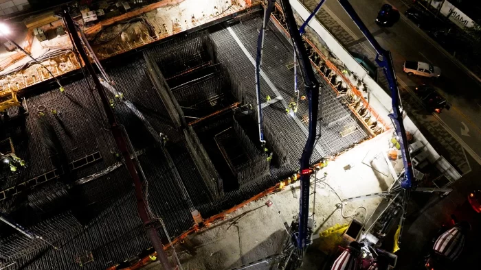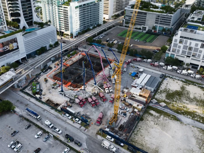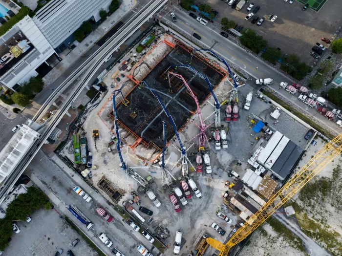 Naftali Group, a national real estate development and investment firm, has completed the foundation pour for JEM Private Residences Miami. The 8,400-cubic yard pour began May 30th and was expected to last approximately 18 hours and requiring 120 trucks making continuous trips to and from the concrete plant, totaling 840 loads of concrete. JEM Private Residences’ construction is being managed by Coastal Construction and is slated for completion in Q4 2027.